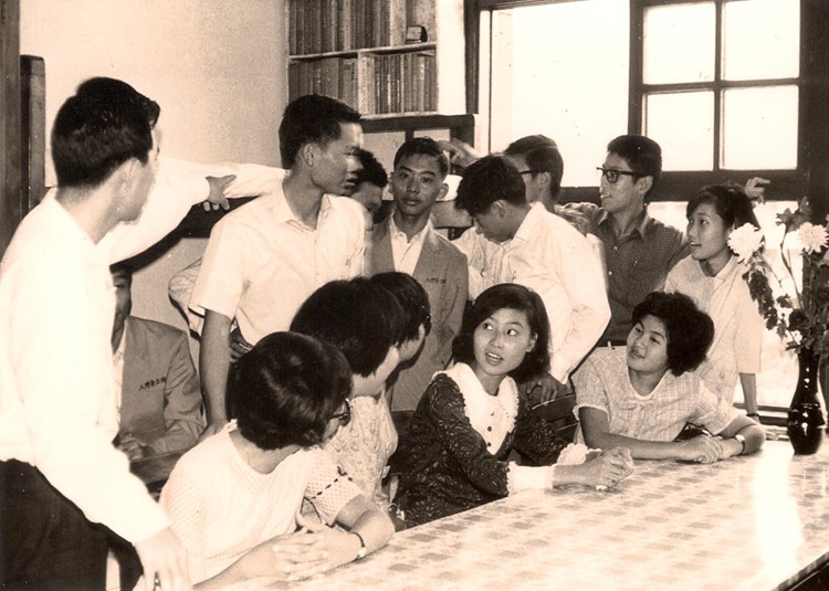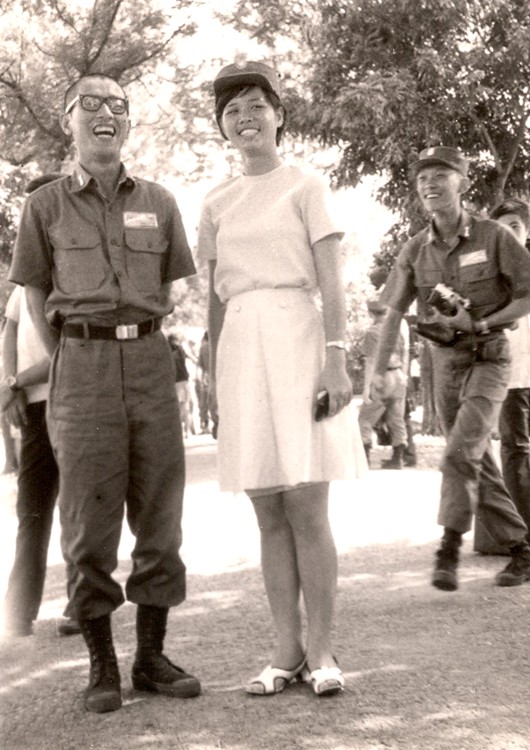 大專集訓懇親會。軍帽被奪,露出個大光頭,左起:陳榮彰,韓德菊。(後走者是張敬禮,張敬新兄弟)