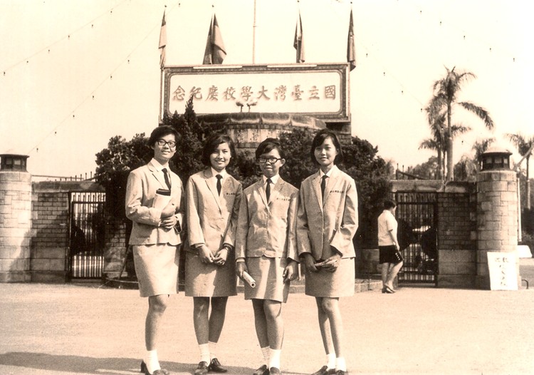 台灣大學校慶。難得穿整齊校服,典禮後於大門。左起:鍾慧娥,劉媛雪,廖佩芳,許志萍
