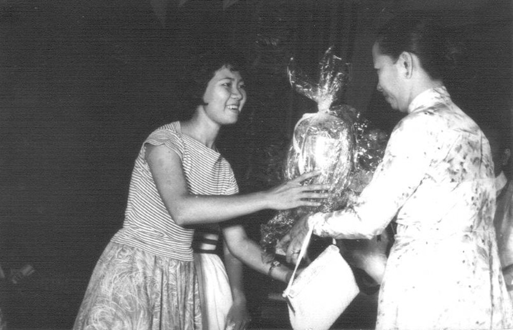 啟智首屆文科班畢業生黃淑秀於1961年、獨佔鰲頭、勇奪越南全國校際學生盃羽毛球比 賽球女子組桂冠的榮耀時刻,頒獎人是當時阮玉書副總統夫人。