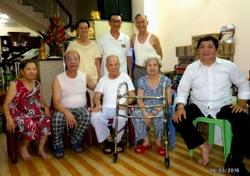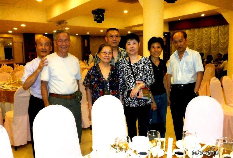 2016年4月3日,梁景輝老師和師母在堤岸賽瓊林酒樓用餐的時候,巧遇從美國而來的啟智門生葉芬(第一排右一)以及其親友。