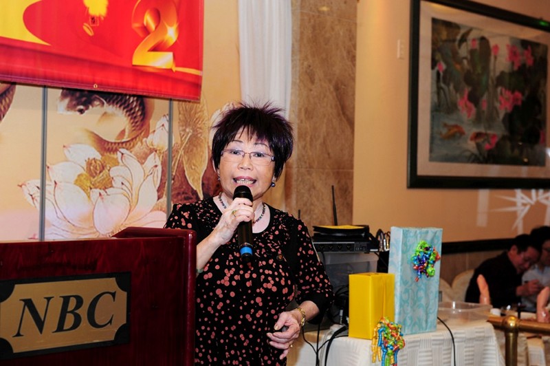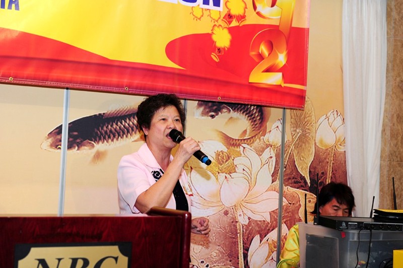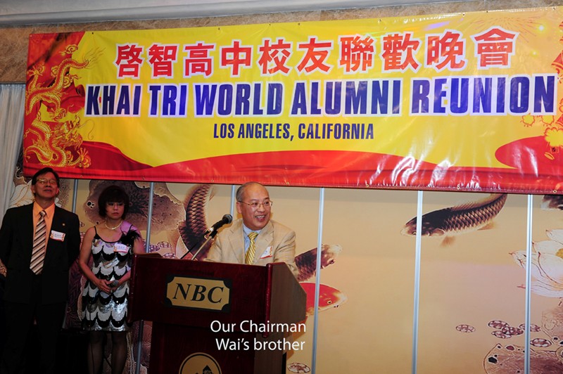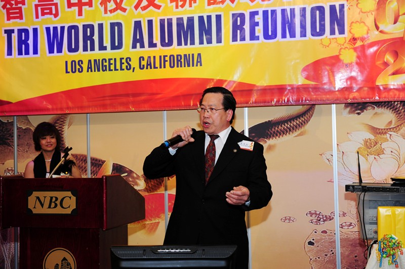 2012年啓智海外校友第二屆聯歡晚會籌備組組長73年文科葉強校友上台致辭。 左邊是兩位金牌司儀:姚福照(72年理科)、廖建珍(76年)