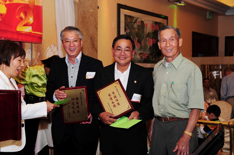 梁景輝老師(右)為晚會頒獎牌給67年文科校友陳文傑(左),嘉獎他為海外校友所作出的貢獻。 左起:陳文傑、陳治國、梁景輝老師
