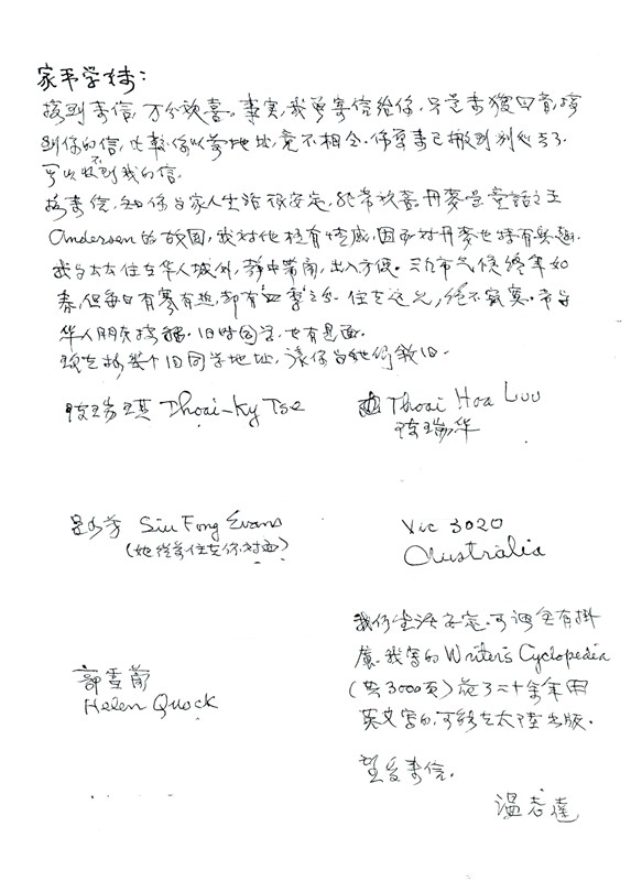 溫老師1907年2月22日在印尼出生,2004年4月16日在美國加州辭世,享年97歲。他五名事業有成的子女,永言孝思,昭哉嗣服。在溫老師逝世12週年,忌辰即將於4月16日來臨之前,為緬懷慈父,女兒們重新精心製作一輯感人的紀念畫冊,圖文並茂介紹父親的生平、家庭、離開越南的難忘經歷、重新在美國建立幸福家園的一生里程。