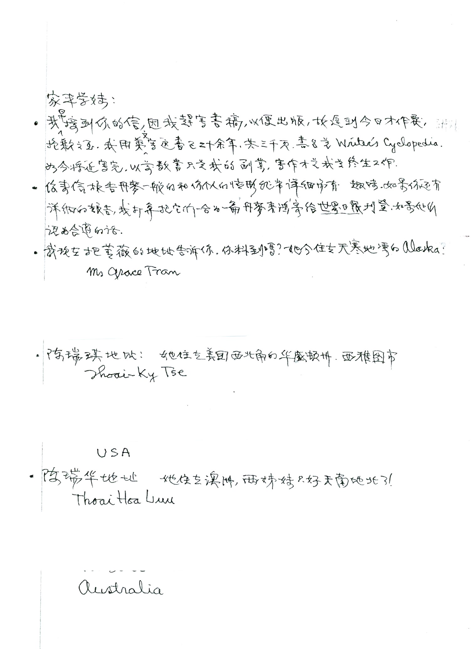 THEIR RELATIONSHIP WITH CHILDREN: In order to escape the tragic war in S. Vietnam, and to build a better life for the children, Dad and Mom had tried their utmost to send us, one by one, to China (before World War II), Taiwan, Hong Kong and America. I was sent to Hong Kong in 1969. At that time, I realized our parents had really worked so hard to provide their children with a better life of freedom. Without their support and loving gesture in hiring a lawyer to submit their application for my entry to America, today I should not have ever lived in this country! I owed them more than I could ever repay for their love. Never should I forget the moments of my deep sorrow amidst my hopes for the future when I had to leave our parents in S. Vietnam. You can imagine my great joy when I was again united with our parents in America in October 1977. Although the passing 8 years had added more gray hair and wrinkles to our parents, they were still healthy and happy to see me. Dad had prepared a big sign: “Welcome to America!” in the living room and I saw it as soon as I walked in. Considering their efforts and sacrifice, I am a very fortunate child!