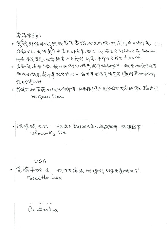 THEIR COMPASSION FOR OTHERS: Mom used to help the poor relatives and friends in S. Vietnam. She sympathized with poor people. In her early years in America, she was dedicated to her church. I was surprised to learn that Mom never missed her Sunday services and was always early. She used to enjoy the company of the children at the church. During her last years, she could hardly walk, but she still tried her best to cook for the members at the Church, which she enjoyed tremendously! Dad used to walk to China Town twice a day. He used to give money to the beggars, or used clothes to the homeless people. He thought those people were less fortunate than he was. He particularly sympathized with those aged people who needed to beg for money and were not cared for by their children. After Dad and Mom finished reading the Chinese newspaper in the morning, Dad would fold the paper neatly and return it to the man whom he bought the paper from, so the man could sell it to another customer for extra money. To others, this could be considered as “unworthy”, but to me, it showed they had a kind heart for people.