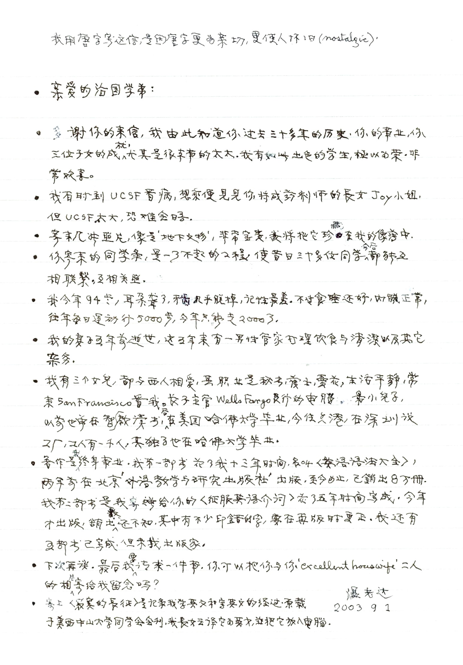 ACCOMPLISHMENTS: Dad had spent 13 years in writing a 1700-page book on Comprehensive English Grammar. With the great support by his student, Siu Fong Evans, and especially the review by the famous writer, Prof. Dao Zhen Zhang, the book was published at the Foreign Language Teaching and Research Press in Beijing, China in late 1998. It received a great demand from people in China. Within a year, it was re-printed for five times. Mom passed away on September 29, 1997. It was with deep regret that she was not able to see this book!