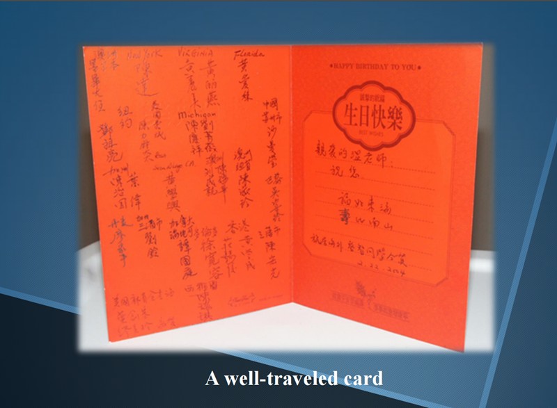 劉鈴校友親自到溫老師家祝賀他的生辰 , 送上這張許多校友簽名的生日賀卡。