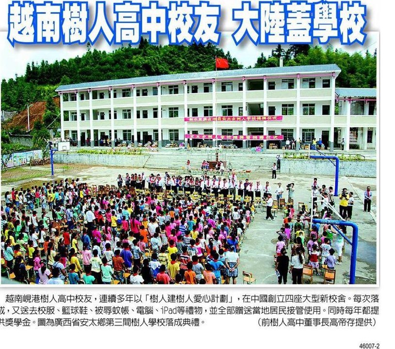二零一四年中阈廣西省安太鄉富祿鄉的樹人學校擴建落成, 舉行了隆重的落成典禮, 此間校友曾派團前往參加